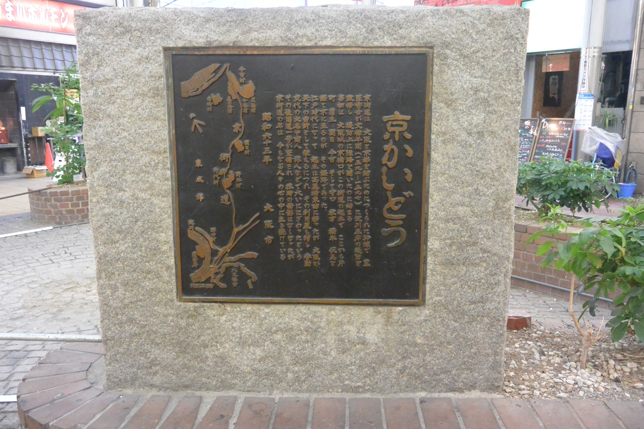 JR環状線に沿って延びている新京極商店街の真ん中あたりの、ドーム型の屋根がある広場に設置されている碑です。新京極商店街は人通りの多いアーケード街ですが、この広場はかなりのスペースがあり、混雑もしません。京街道の痕は各場所に残っているのでそれをたどる旅というのもおもしろそうですね。