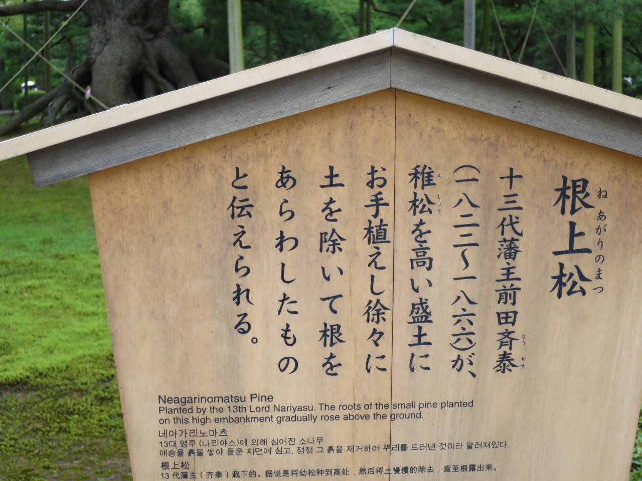 金沢 兼六園の千歳台に立つ、根が土の上に出た大きな黒松です。2mほど根が土上にせり上がり、映画の様に今にも松が歩き出しそうな景観は圧巻です。3代藩主 前田斉泰が土をせり上げてから松を植えて、その後土を取り去ったと言われています。