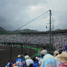 緑に囲まれた球場です。後ろのほうには屋根席もあります。売店ではビールも売っています。350ミリが350円。500ミリが500円です。