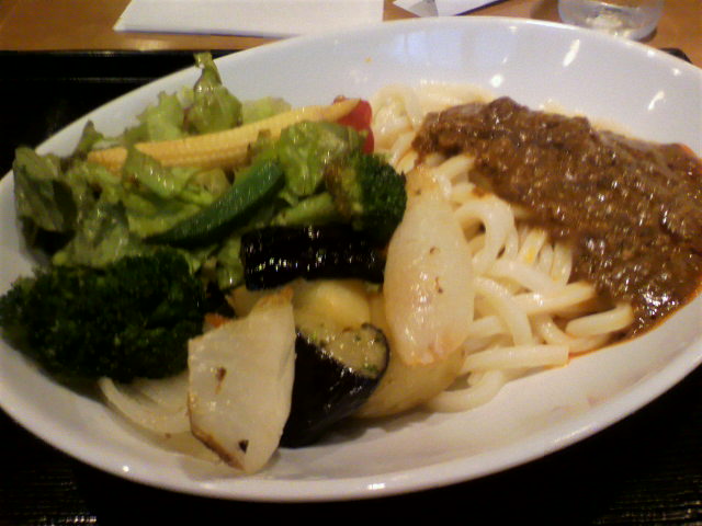 冷たいうどんに温かいキーマカレーがかかっていてます。キーマカレーはしっかり辛くていい感じ。野菜はほんのり塩味がついてるけど、カレーと絡めても美味しいかったです。