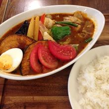 平日のランチに行きました。平日割で一日分の野菜が取れるスープカレーが980円でした。卵、じゃが芋、人参、竹の子、枝豆、トマト、レンコン、ナス、カボチャ、ヤングコーン、おくら等の野菜が入っていてお腹一杯になりました。辛さも選べ、とても美味しかったです。