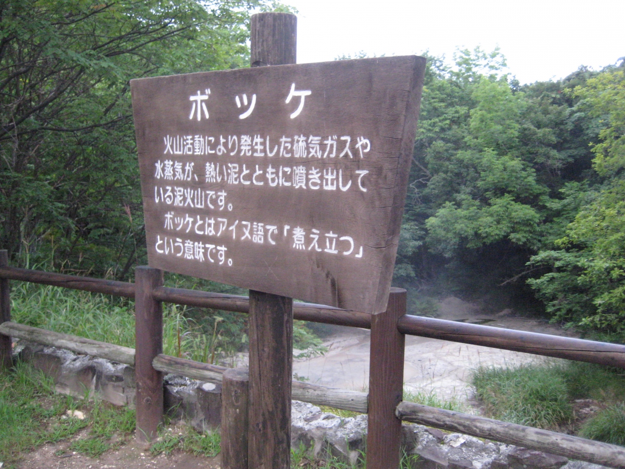 散策路は湖沿いのものと山中散策と2種類のコースがあったが、私は湖のコース。木々の隙間から阿寒湖の眺望がいいところにはベンチが用意されていた。また、「ぼっけ」という地下からの熱で地面がぶつぶつと煮立ったような状態に見えるところをみて感動した!。このまわりは硫黄のにおいが立て込めて、少々あたたかさもあった。自然の織り成す現象をとらえられて満足した。これを見れただけでも阿寒湖に来てよかったと感じたほどだった。