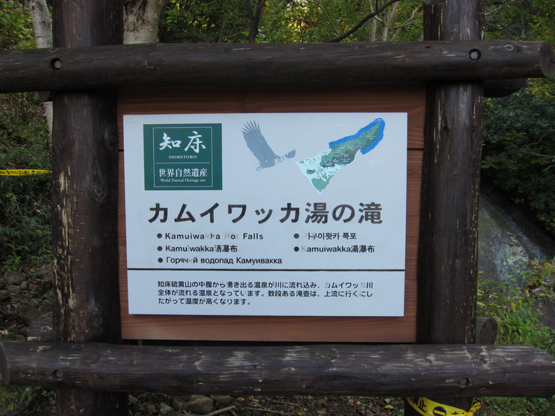 カムイワッカの滝と思っていましたが、滝の前の案内板は「カムイワッカ湯の滝」となっていました。