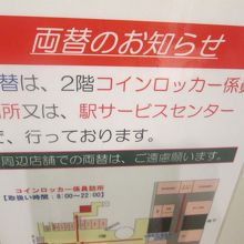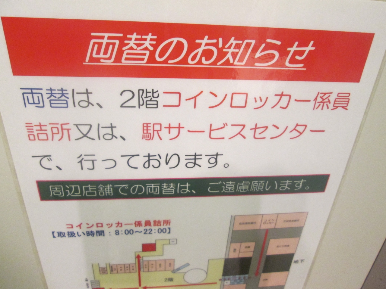 スイカを財布から出して支払いをしようとしたところ、もちろんココは関西。スイカでコインロッカーは使用できず(当たり前)、1000円札を両替しようとしましたが、両替機はなし。