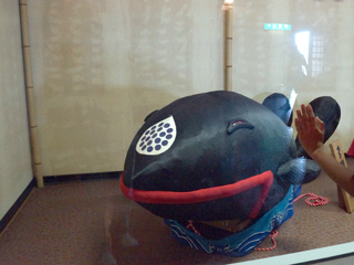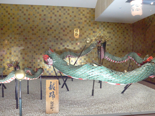 龍踊りの白龍、青龍、各町の奉納踊りを先導する傘鉾などが展示されております。