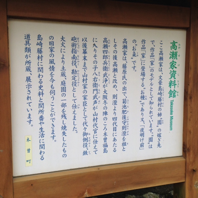 木曽の旧家である小泉家と橋本家を中心に、明治時代の家長制度を描いたのが島崎藤村の『家』です。実は、小泉家は藤村の生家をモデルとしており、橋本家は藤村の姉である園の嫁いだ高瀬家がモデルとなっています。この資料館には、藤村ゆかりの手紙や写真などが展示されています。