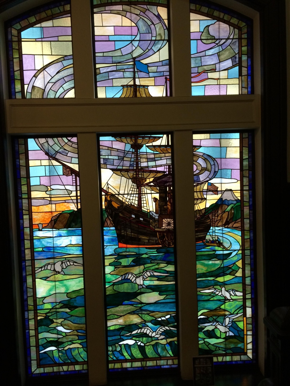 2階のホールと中央階段にあるステンドグラスがきれいですよ。