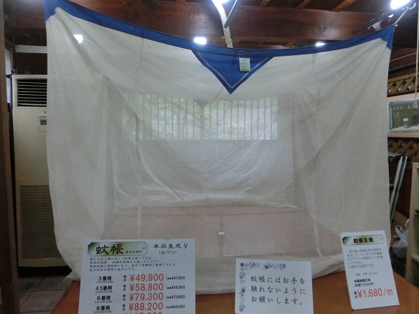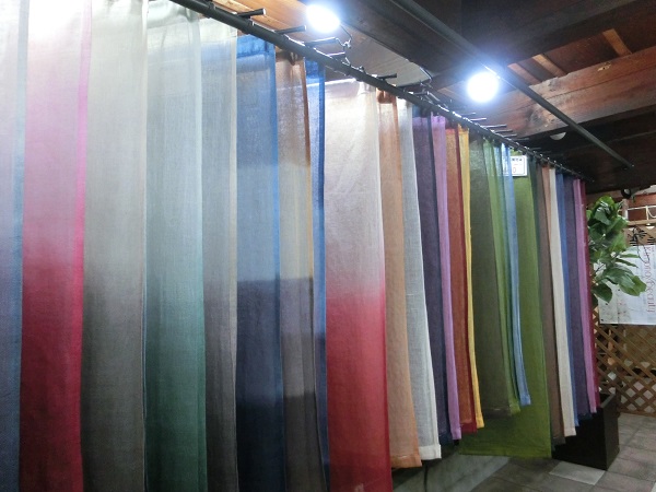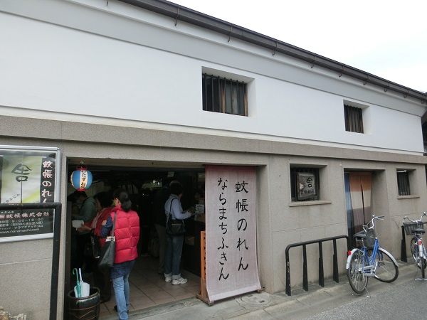 店内には色鮮やかな暖簾が天井から吊るされています。ならまちふきんは『蚊帳』の生地が使われているので、とても丈夫で長持ちします。暖簾とおなじく色鮮やかでふきんにすのはもったいない気もします。その他、同じ生地で作られてコースターなどもあります。