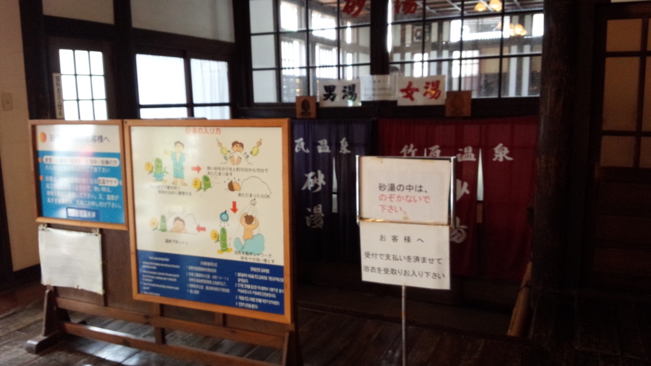 歴史のある建物です。旅行中は天気が悪かったので、室内で砂湯体験ができるこちらを選びました。砂湯代の1030円コインロッカー代の100円必要です。