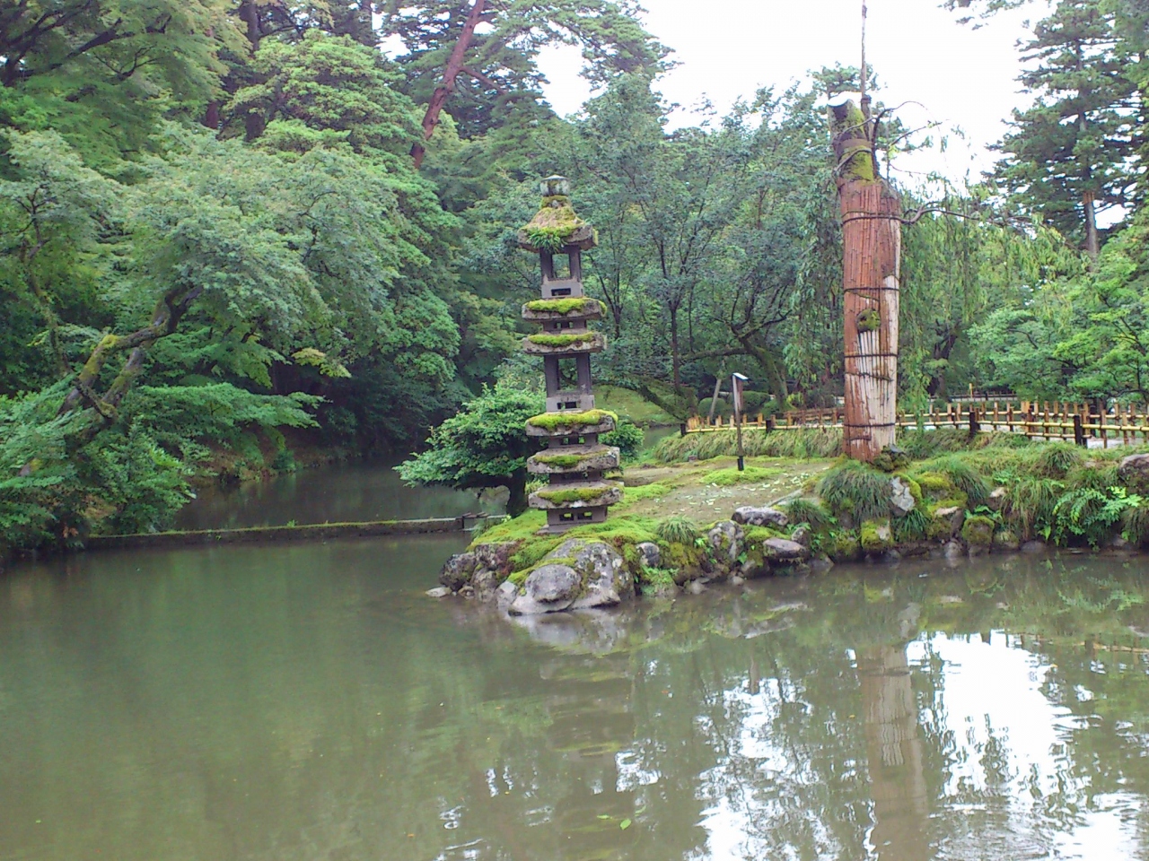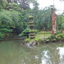 兼六園の奥の方にある瓢池の中島に建っています。瓢池の中島には歩いて渡ることができるので、間近で見ることができます。兼六園にはあちこちに石塔がありますが、この海石塔は苔むした感じが周りこ光景にマッチしていていい感じです。