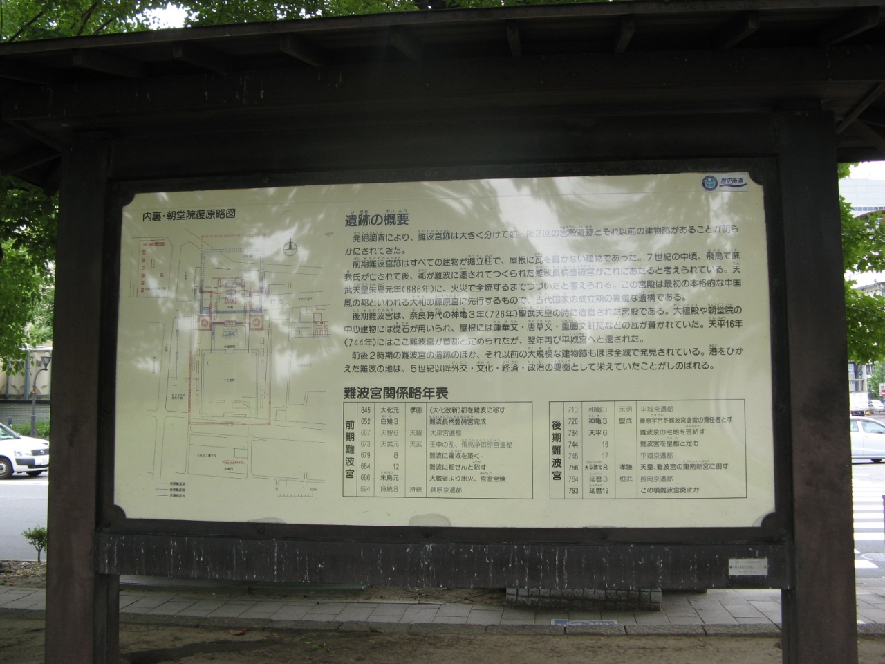地下鉄谷町線の谷町四丁目から歩いてすぐのところにあります。「大化改新」後に造営が始められた“難波宮”跡を史跡公園として整備されたものです。後期難波宮の大極殿基壇や前期難波宮の八角形建物などが立体的に遺構表示されています。