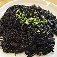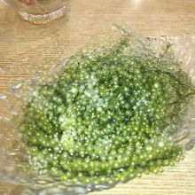 ユーグレナモールはおみやげ屋は多いですが、飲食できるところはそうでもありません。ここはモールから1本外れたお店です。沖縄料理がたくさんありますので、観光客におすすめです。ランチにてイカスミソーメンチャンプルーと海ぶどうを注文。前者は炭で黒くなるので割り箸で食べるように指示されました。