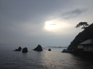 朝日をみに夫婦岩にいきました。夫婦岩の真ん中から朝日がでて、すがすがしい気持ちになりました。海の神様がいたり、参拝する神社があります。また。海沿いをあるく遊歩道もあり、朝の散歩にちょうど良いのではないかと思います。