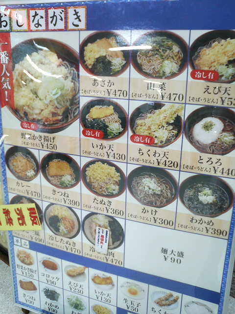 カウンター席・テーブル席合わせて10席ほどの小さめなお店で、メニューは「かけそば(300円)」「野菜かき揚げそば(450円)」など首都圏の駅そばに比べると少し高めですが、早く食事をしたい時はそれなりに便利です。