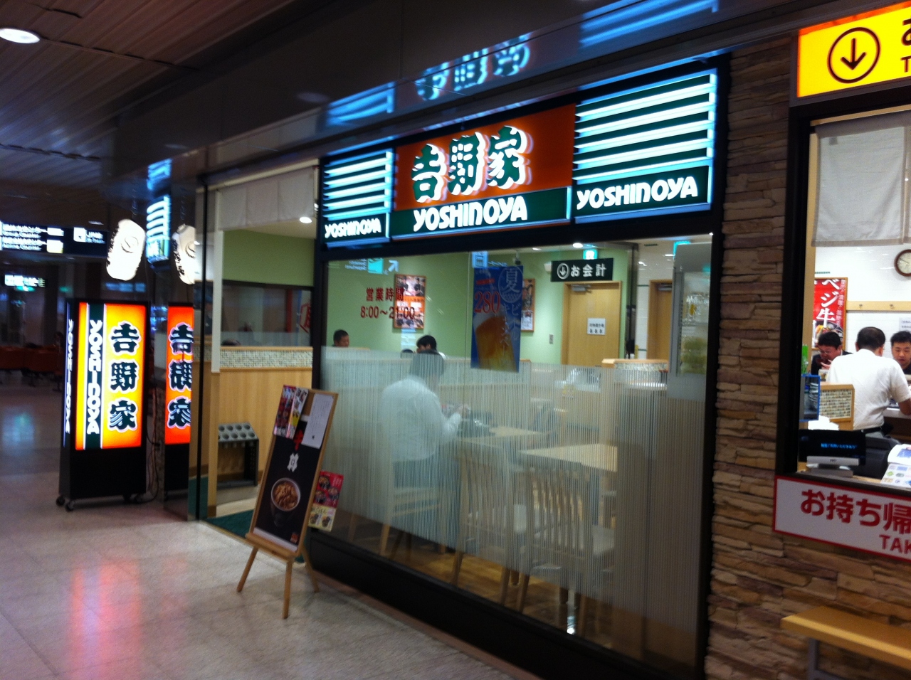 新千歳空港の1階にある吉野家。19時前の店内は半分くらい埋まっていて、サラリ―マン風の男性が多かったです。子連れでの入店でしたがテーブル席でゆっくりできました。スタッフの方も親切で、子供用のカトラリーなどを用意してくれたり、笑顔の接客が印象的です。外食続きの旅の中、なじみの味にお腹も落ち着きました。