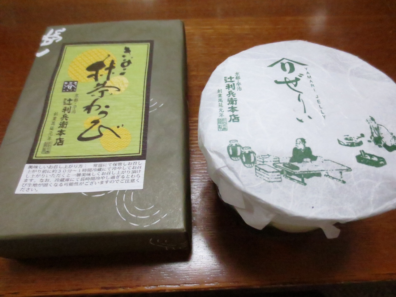 辻利兵衛はネット販売や色々な抹茶のお菓子を売っているお店です。この日は抹茶のわらび餅とゼリーを買いました。わらび餅は冷蔵庫に入れると固くなるので入れないでと言われましたが、冷たいのを食べたかったので入れましたが、気になるほど固くなりませんでした。ゼリーは小豆も入ってましたが、ゼリーは抹茶の量が多いのか苦い感じがしてイマイチでした。全体に甘かったので、家族にあげてしまいました。緑が鮮やかですが、抹茶以外で色を付けてるようで、私は抹茶が少なくてもそのままの味が好きかなと思います。
