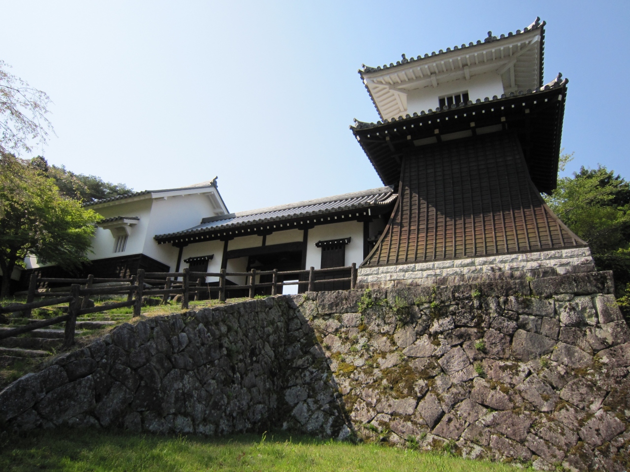 城下町の終わりに復元された太鼓櫓等が見えてきます。
