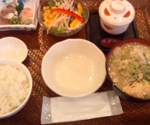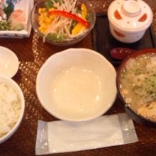 以前は海鮮丼を食べたのですが、今回は、魚汁定食880円にグリーンサラダ100円を注文してみました。