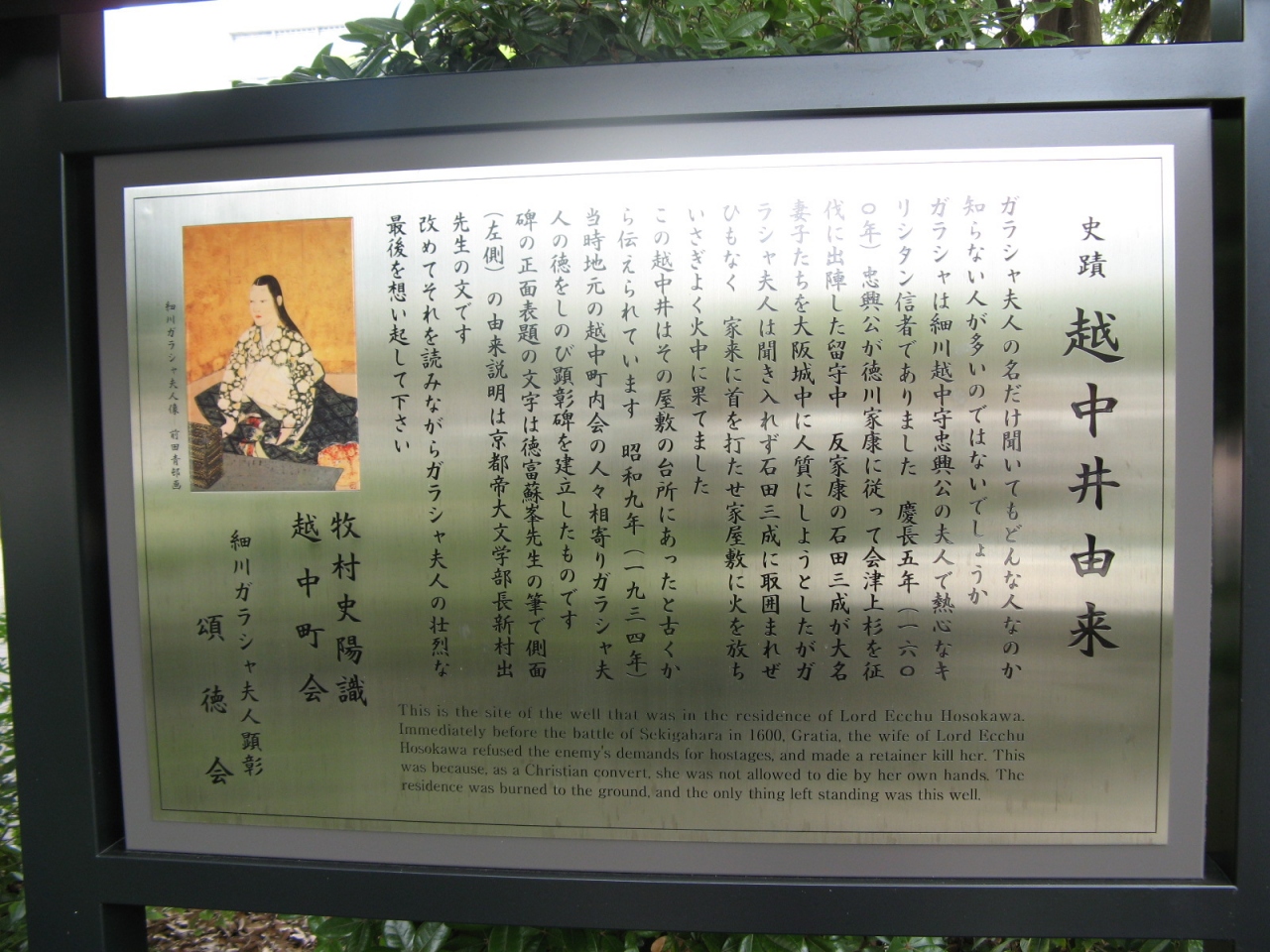 現地にある説明版には、細川忠興の正妻である細川ガラシャが最後を遂げた場所という事が記されています。説明板の写真を添付しますので参照下さい。