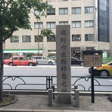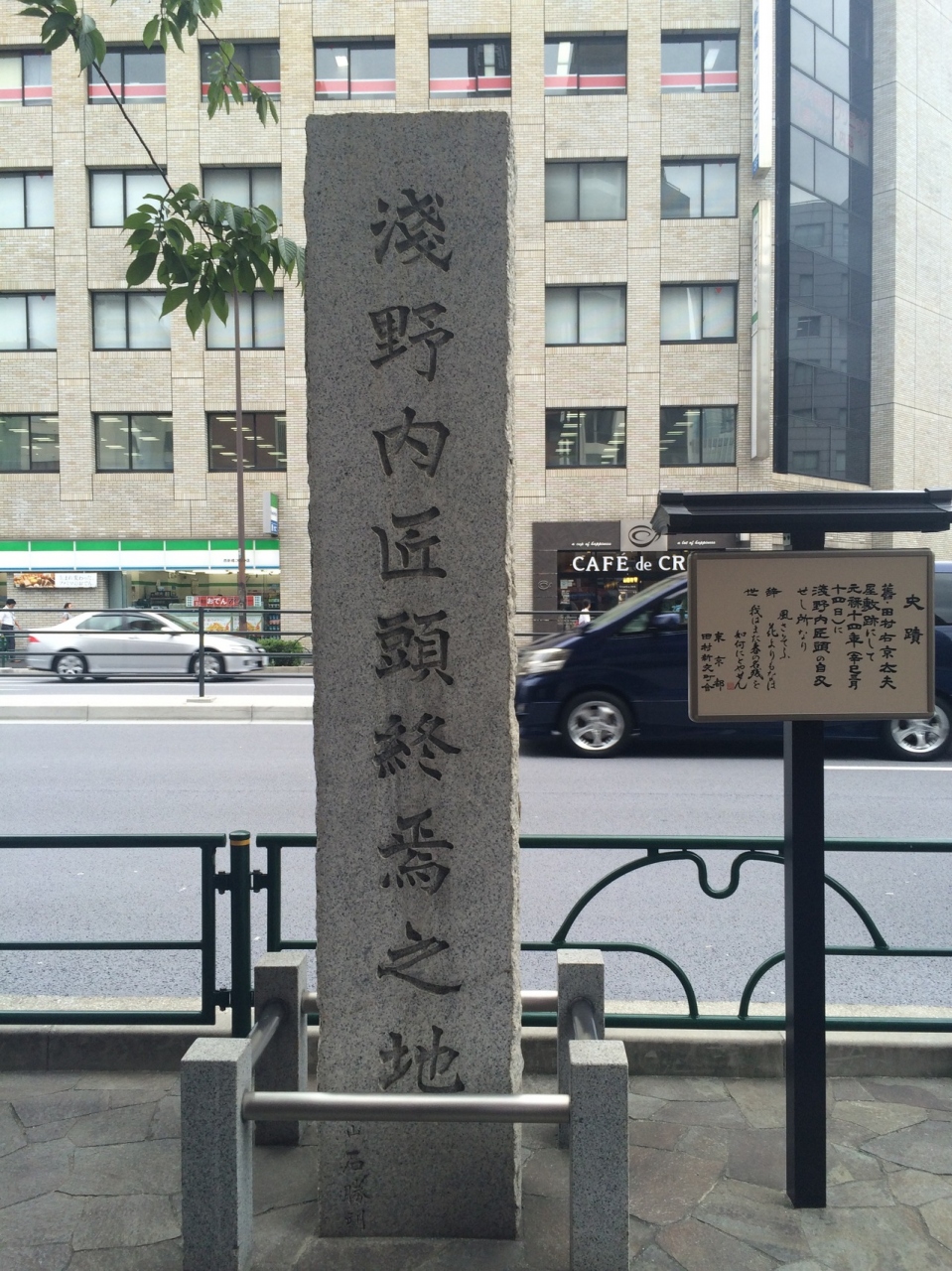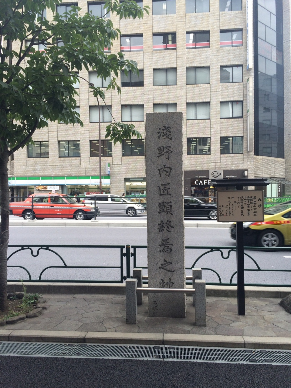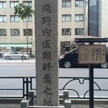 幹線道路沿いを歩いていたら新しい石碑があり、見ると浅野内匠頭終焉の地と石碑に大きく書いてあり、石碑の周りは石で囲んであります。簡単な説明文が横にあるだけで寂しい感じですが石碑は立派です。人通りも多い場所ですが皆見向きもせず通り過ぎていました。