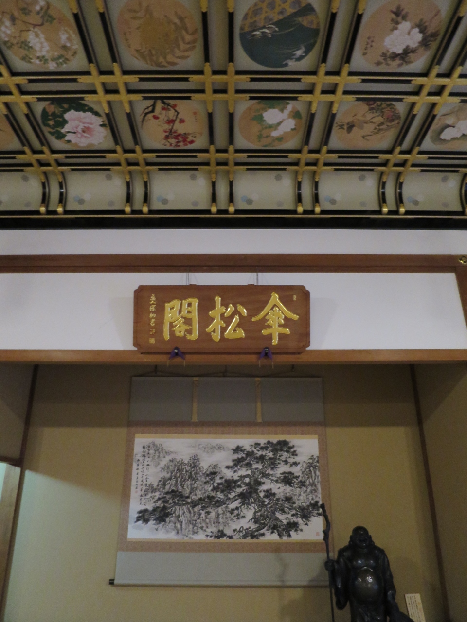 永平寺を参拝すると、先ず伽藍の説明を受けた後に2階に上がり、最初に入るのがこの傘松閣です。現在に傘松閣は二代目で、160畳敷きの広間の天井には230枚の花鳥図がはめ込まれており見物です。畳の上に寝転がって見上げたいところですが、みっともないのでやめました。