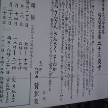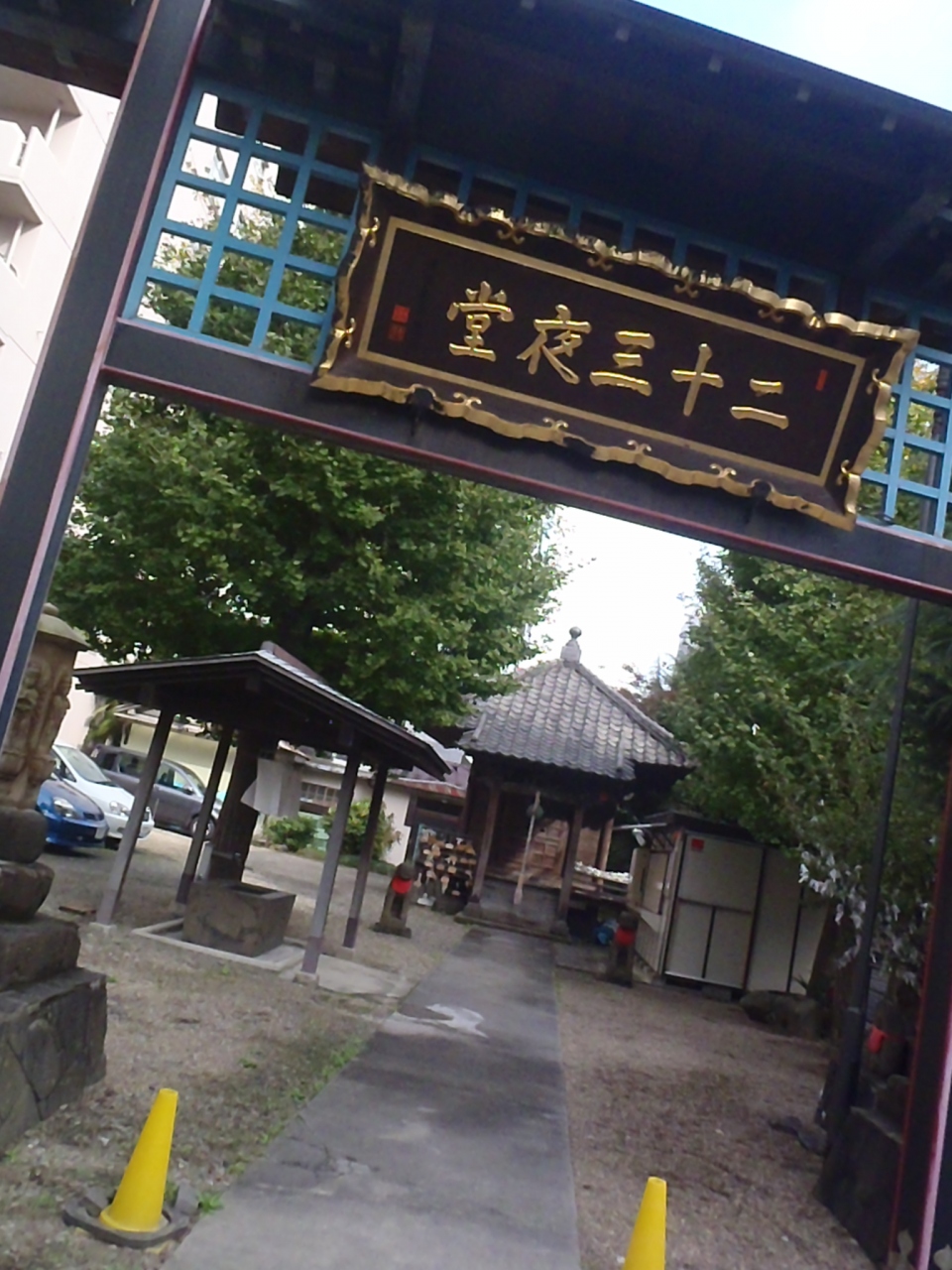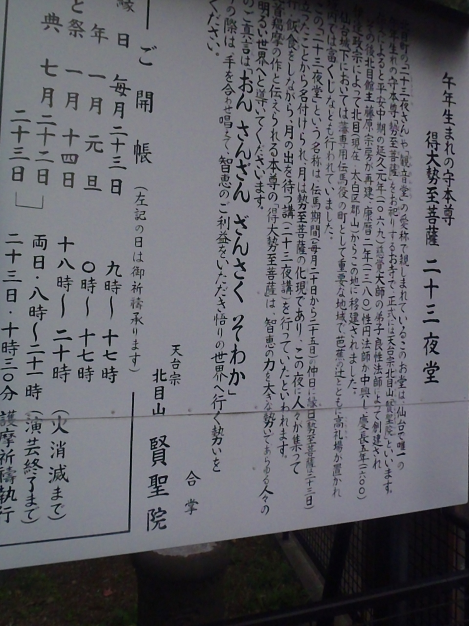 案内板によると、名称は伝馬期間の仲日23日に縁日が建つことから付けられ、月は勢至菩薩の化身でありこの夜に人が集まって飯を食べながら月の出を待つ二十三夜講が行われていたそうです。