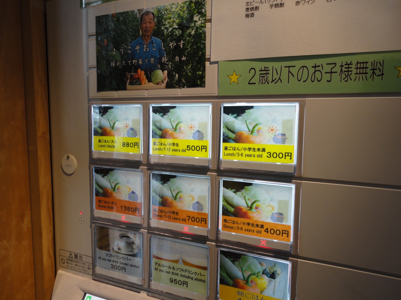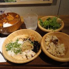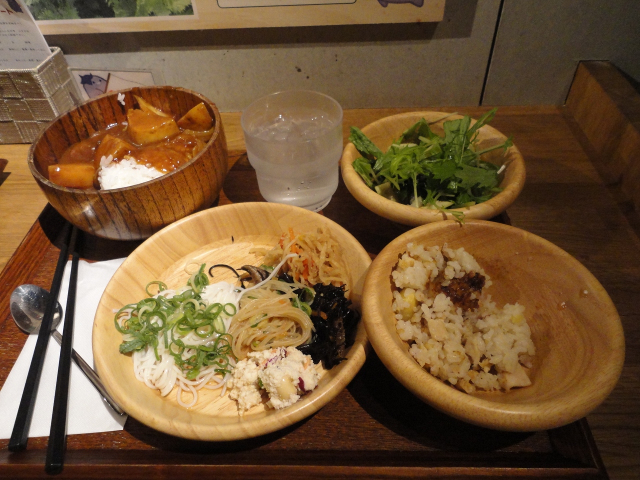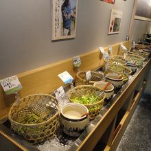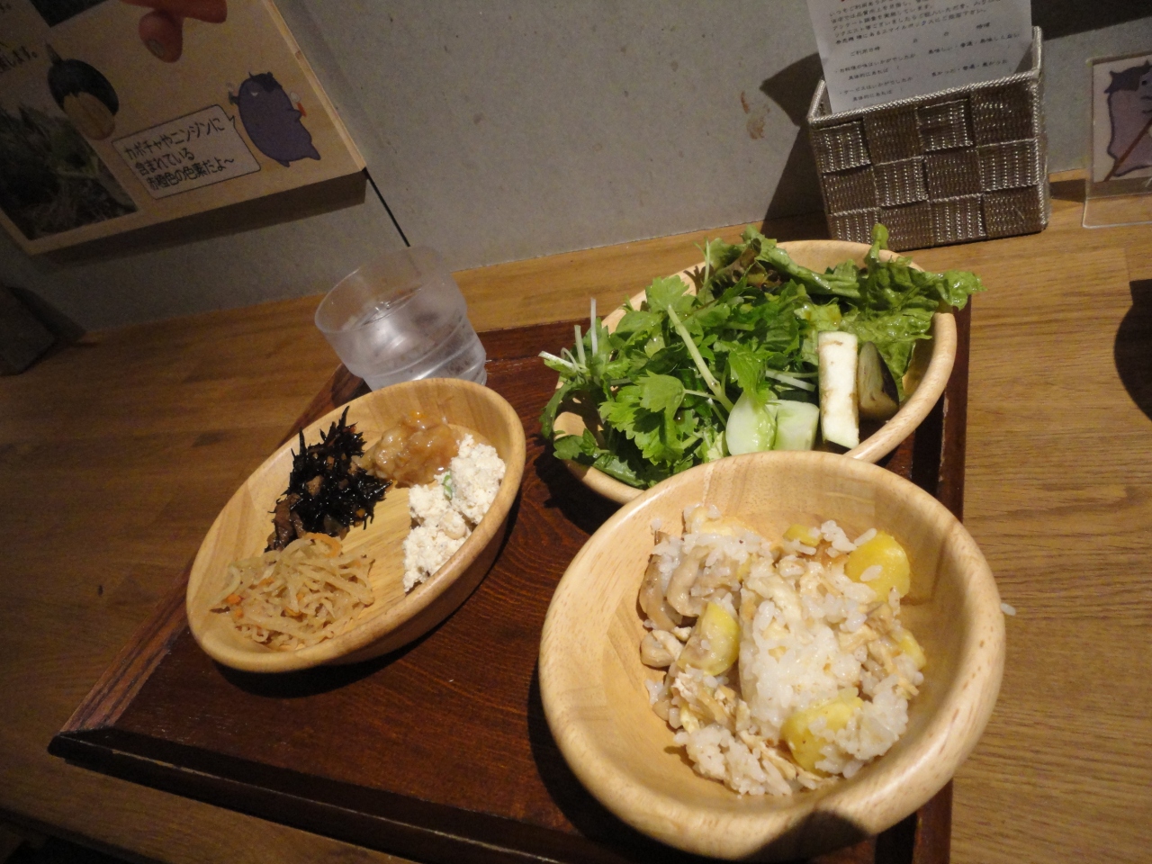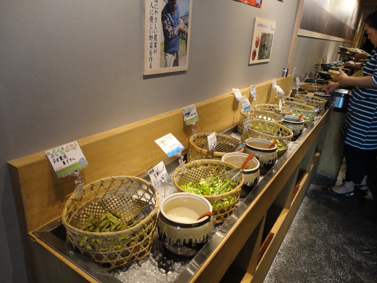 野菜たっぷりのメニューでバイキングです。食器は木製。入口の所で食券を購入します。サラダは京野菜で生で食べれるピーマンや白きゅうりなど多数。ドレッシングもたくさんあって、私は大根おろしや一味マヨネーズとかがおいしかったです。煮物や炊き込みご飯やみそ汁も薄味でおいしいです。