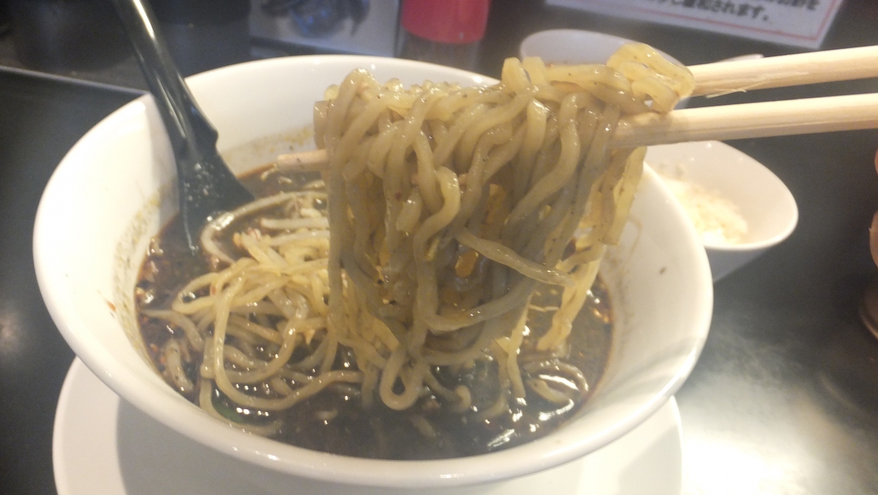 濃厚な胡麻ペーストに挽肉、モヤシ、ニラなどが入り、唐辛子と花椒の麻辣がかなり効いています。麺は、太麺。