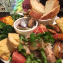 なんばにある居酒屋風イタリアンバル。平日なのに満席です。予約してよかった。10種の前菜盛り合わせがなんと980円と破格です。しかもとても美味しいです。他にサラダとかも美味しくてかなりお気に入りの1件です。