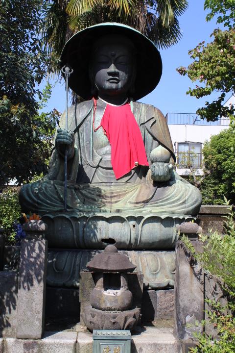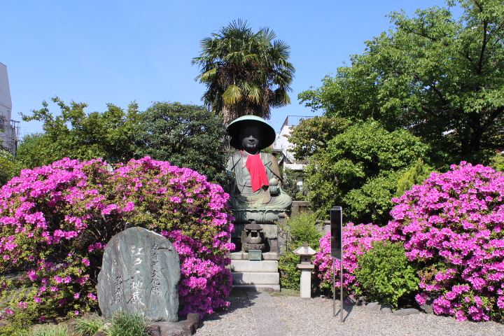 清澄白河駅から徒歩2分程、清澄庭園と深川江戸資料館の間に位置する霊巌寺の境内に存在感のある大きな江戸六地蔵第5番・地蔵菩薩坐像が安置されています。地蔵菩薩坐像の周りにはツツジが植えられていて丁度綺麗に咲いていました。