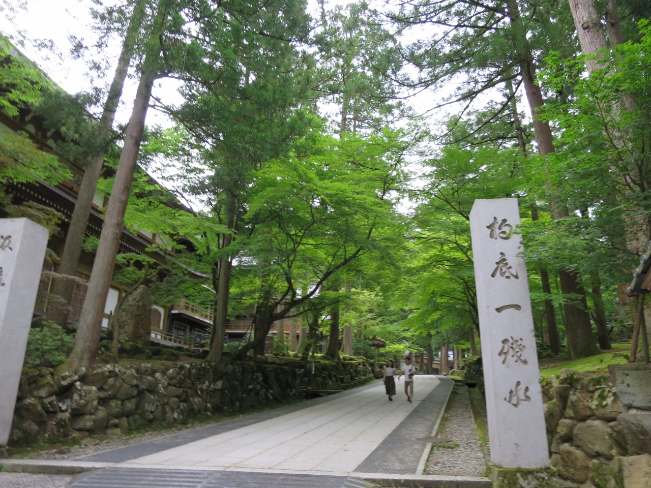 大きな木々が立ち並ぶ山の中に大きな伽藍があり、全国の禅宗修業僧がこの永平寺にて修業をされる高貴なお寺です。各お堂が渡り廊下、階段で繋がれており、参拝中も多くの修行僧が修業されている風景を垣間見ること出来ます。