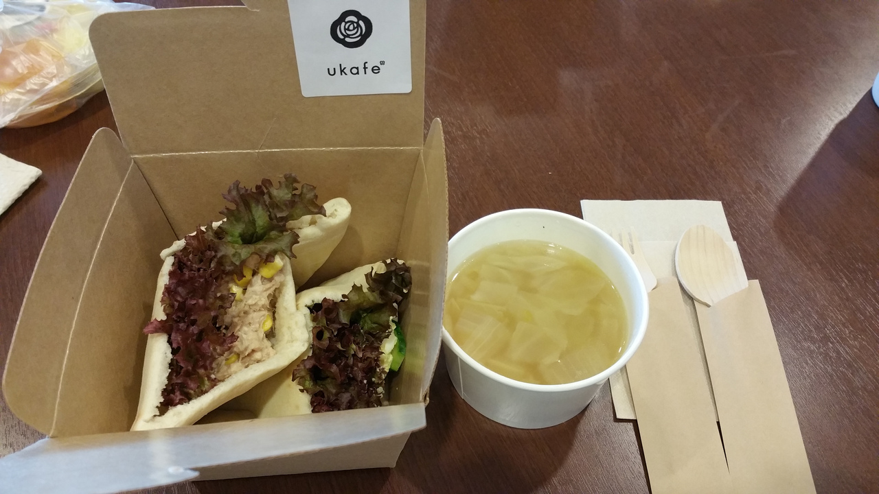 テイクアウトのピタパン、スープのランチを購入しました。