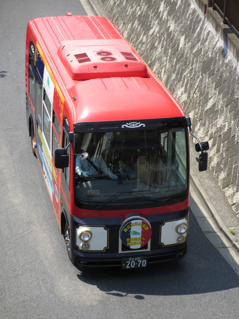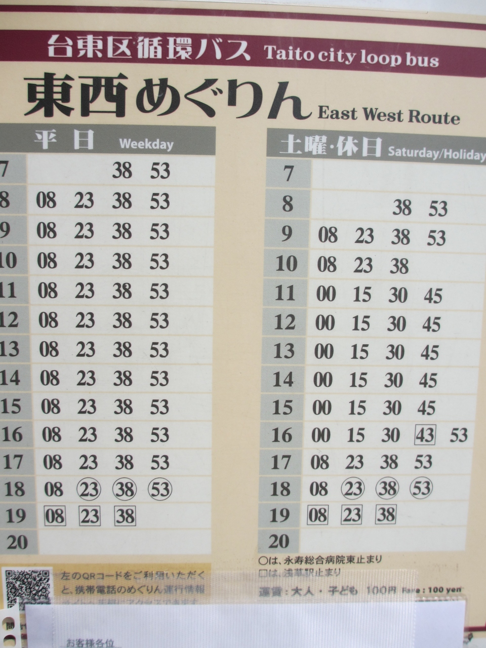 台東区循環バスです。上野駅を通るバスは2コースあり、一つは浅草方面を、もう一つは谷中・千駄木方面を循環しています。運賃は子供も大人も100円で、およそ15分ごとに走っています。また浅草からはもう1コース、鶯谷駅や三ノ輪方面を回るめぐりんも走っています。下町の裏道も走るので情緒があります。