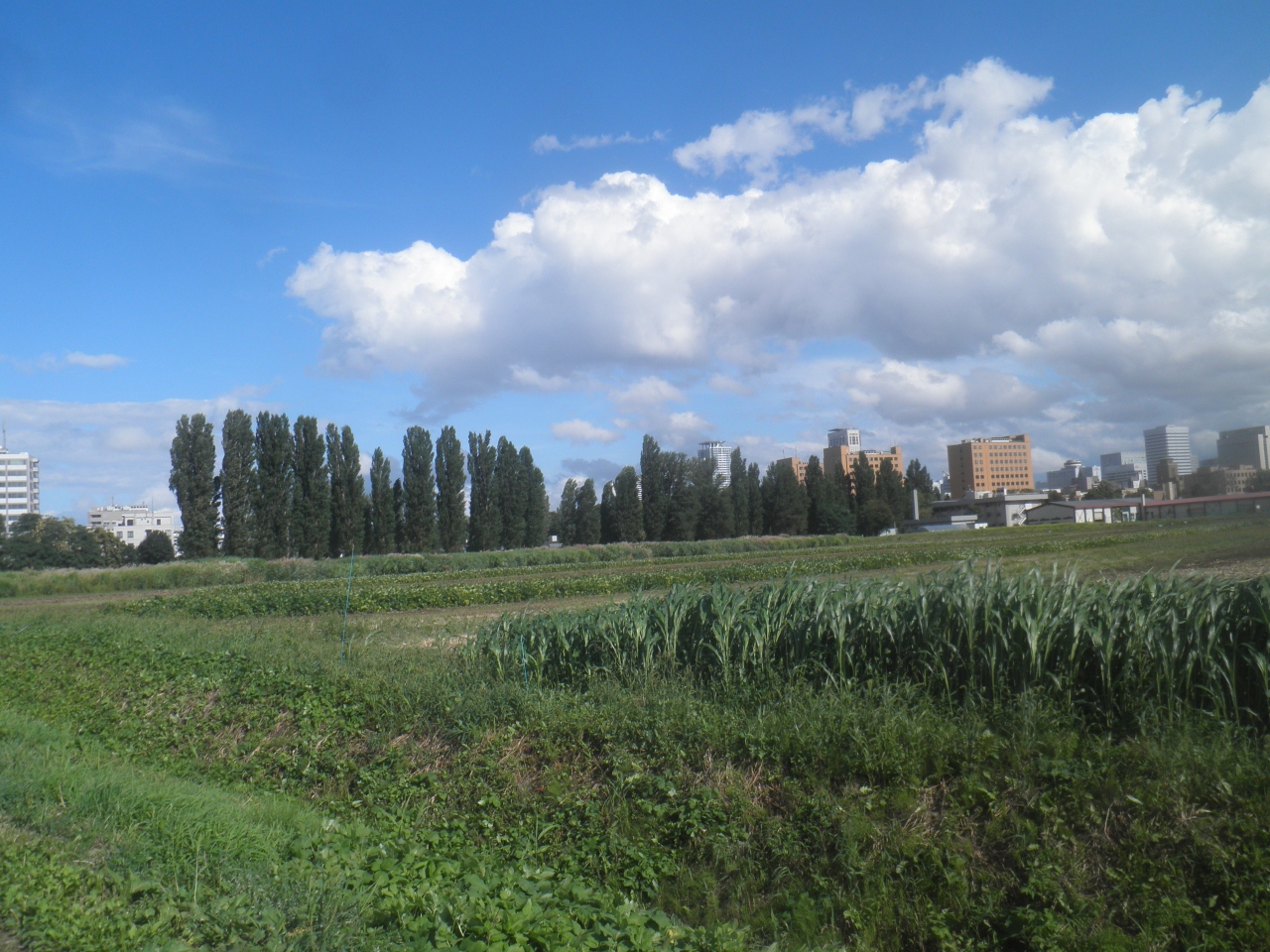 9月の上旬に札幌の北海道キャンパスを散策しました。 JR桑園駅駅のほうから畑の中の道を歩いていくと、有名な北大ポプラ並木が見えてきました。 9月なので樹木にはたくさん葉が茂りモコモコした感じです。 畑には大きなとうきびが伸びて、夏らしいかんじでした。