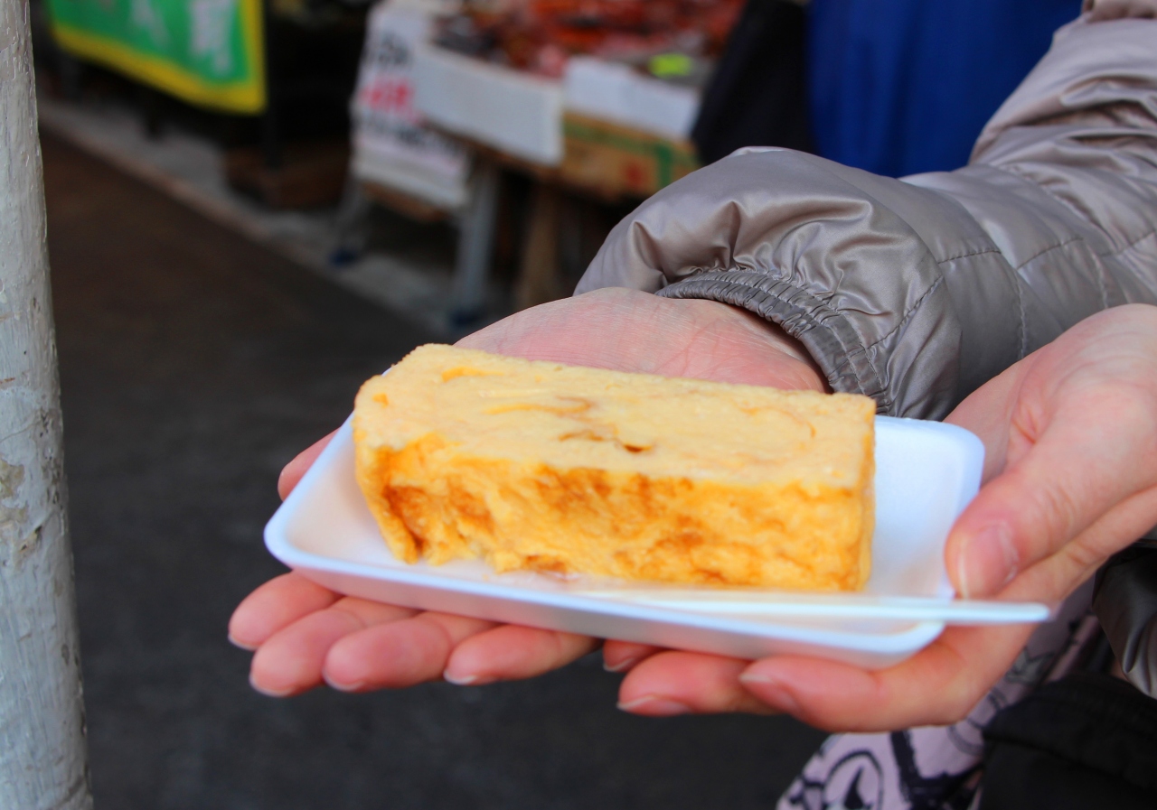 店舗があるのは、築地の場外市場で、朝早くから卵焼きを求める人たちで賑わっていた。