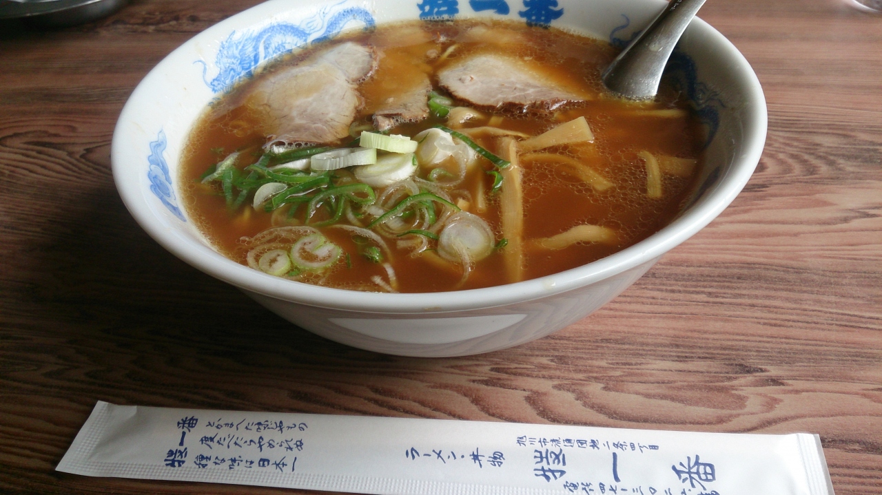 特一番は、古くからやっている旭川ラーメンのお店、子どもの頃も良く行きました。鶏がら、煮干しのコクのスープが好きで入ってみました。ここは木工団地や流通団地が近いので昼は、けっこう混んでいます。当然、しょう油ラーメンを注文。昔と変わらず金のレンゲです。スープも変わらぬ優しい味。麵もおいしく大満足です。営業時間は、午前11時から午後3時までと短く、日曜日がお休みという完全に、周りで働く人たちの店です。