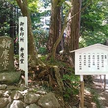 月見坂を少しのぼると、左側に見えてきます。白い立札に弁慶堂とあるのですぐに分かりますが、うっかりすると見過ごしそうな感じです。