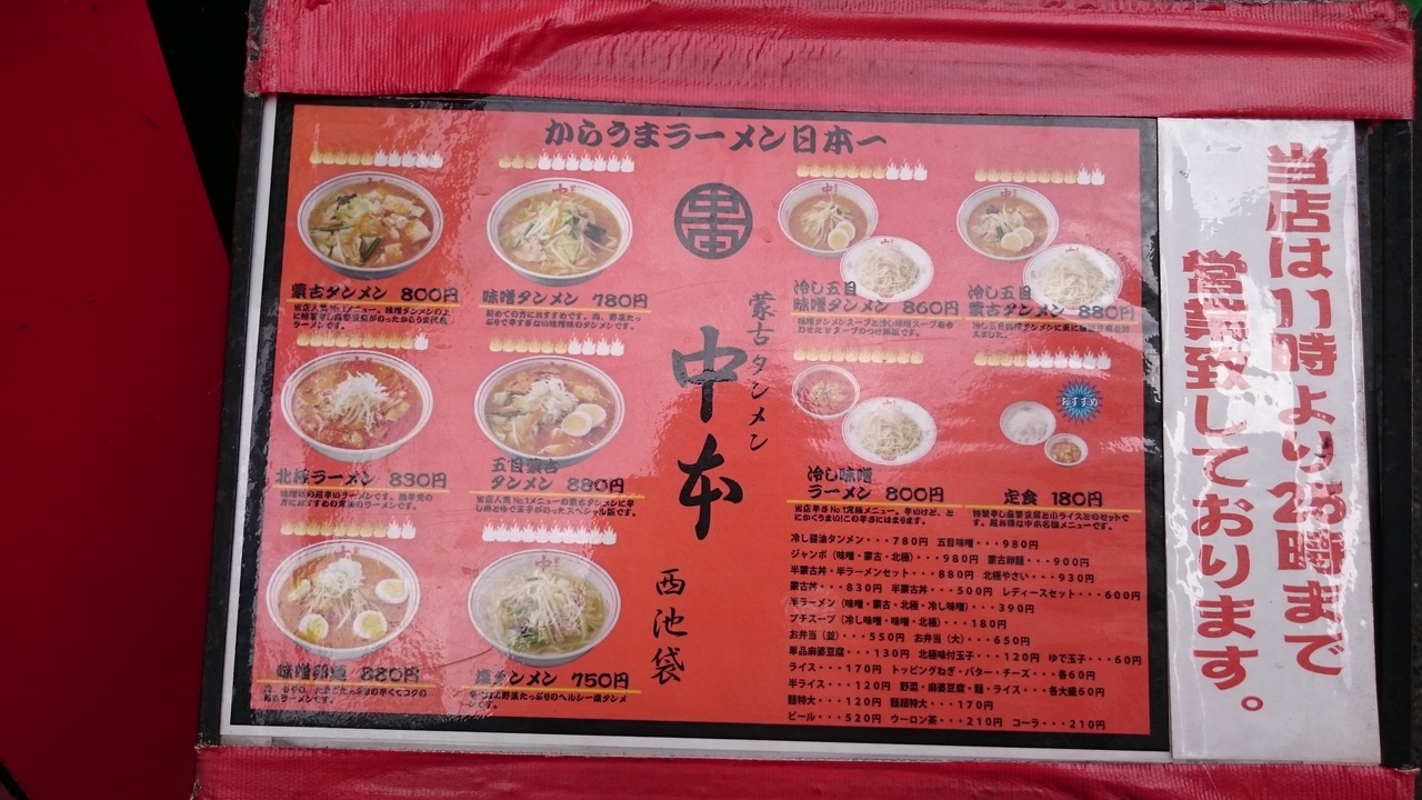 辛いタンメンで、人気。蒙古タンメン800円が、人気ナンバーワンとのことで、食券を買う。つまり、入店時にメニューを決める必要がある。店外のメニューをよく見た方が良い。蒙古タンメンは、野菜の少ないタンメンに辛い麻婆豆腐をのせた感じ。キャベツがゴロゴロ入る。辛くて、口にできないほどではないが、スープを飲み干したら、汗が出た。