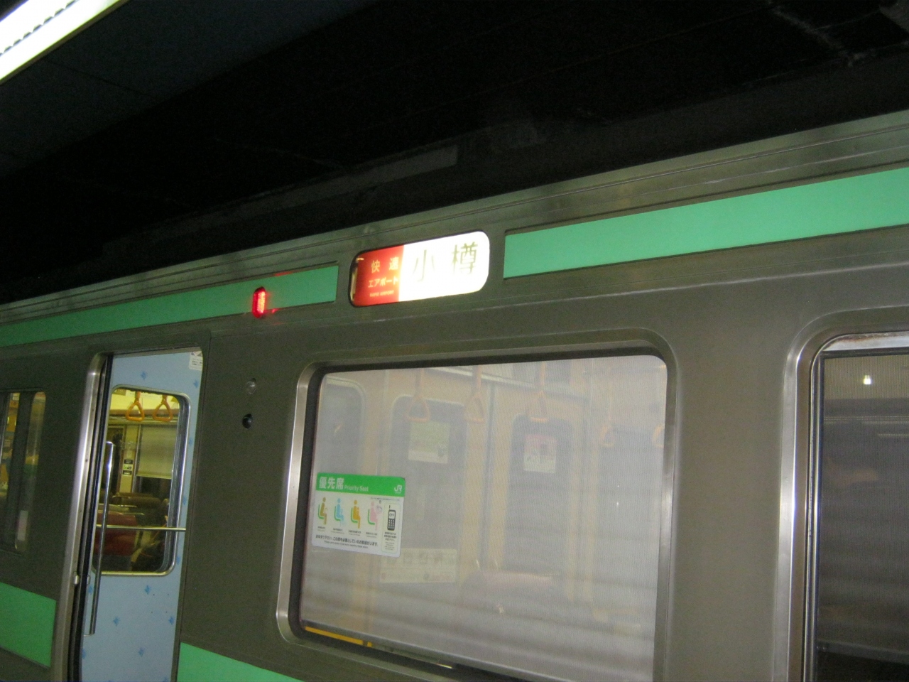 空港から小樽まで1時間15分。新千歳から小樽に向かうときは進行方向に向かって右側に座ると石狩湾がきれいに見えます。札幌からはけっこう混むので大きなスーツケース等を持ってる場合は邪魔かも。指定席の車両があるので注意。
