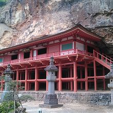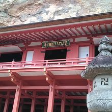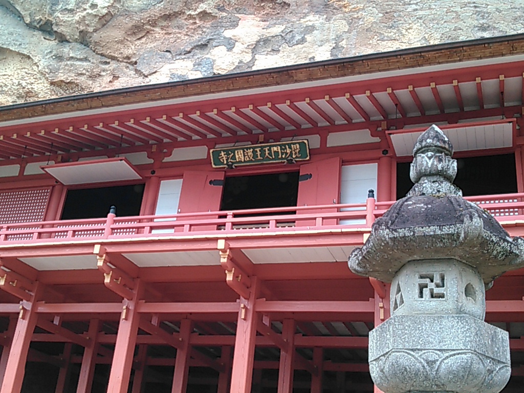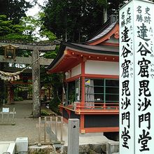 朱塗りの鳥居と岩に張り付くように建っている毘沙門堂は見事でした。