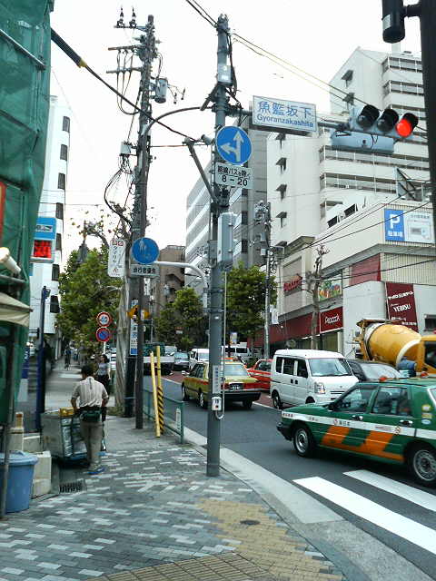 坂の東側にある魚籃寺に「魚籃観音」が祀られていることにちなんでこの名が付いたとのことで、坂の周辺は昔からの商店やスーパーなどが混在していて人通り・交通量が多かったです。