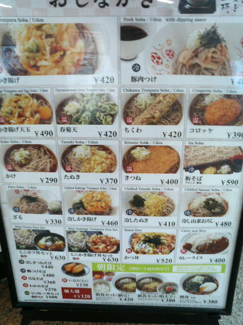 「かけそば(290円)」「かき揚げそば(420円)」など立ち食いそば屋にしては少しお値段高めかなという感じですが、電車の乗り換えついでに改札から出ないで食事を済ませたい時には重宝します。