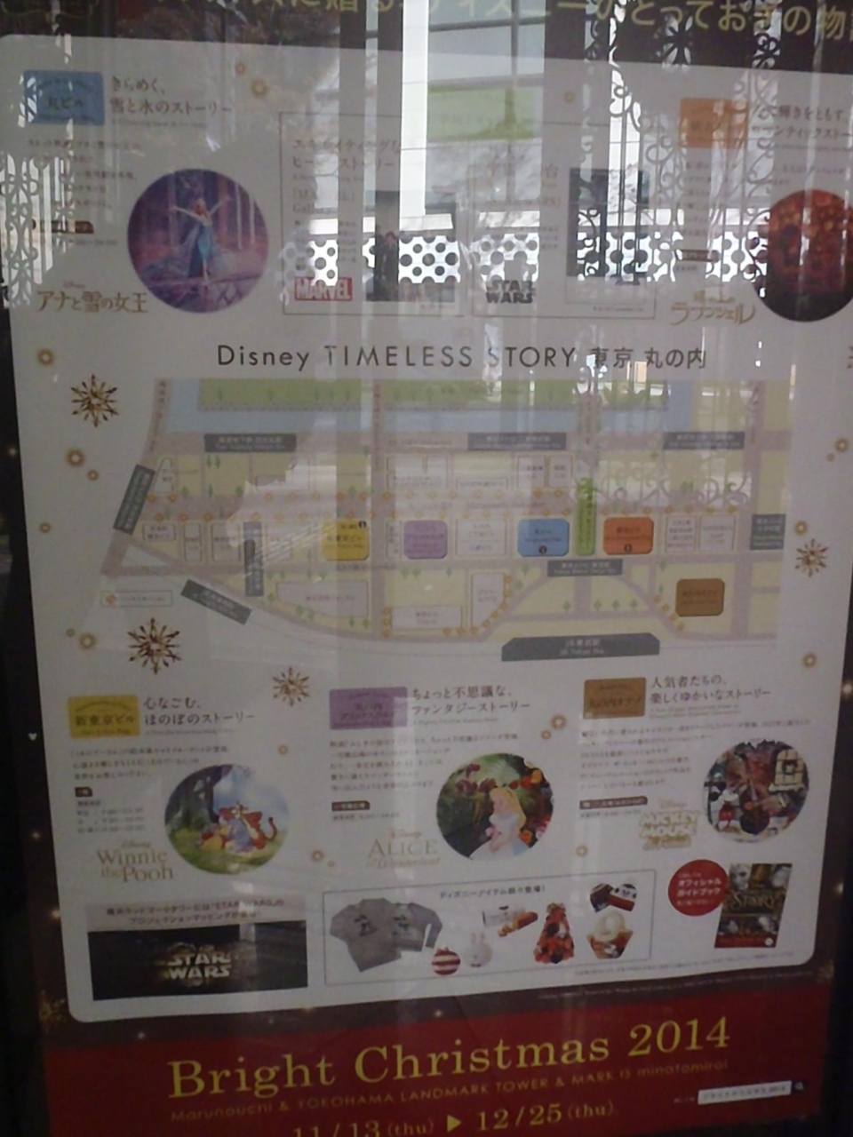 この時期恒例になりつつある丸の内界隈とディズニーのコラボ企画丸の内ディズニーイルミネーション2014は丸の内オアゾ、新丸ビル、行幸地下ギャラリー、丸ビル、丸の内ブリックスクエア、新東京ビルに各箇所ディズニーキャラクターをテーマにクリスマスイルミネーションが飾られている。
