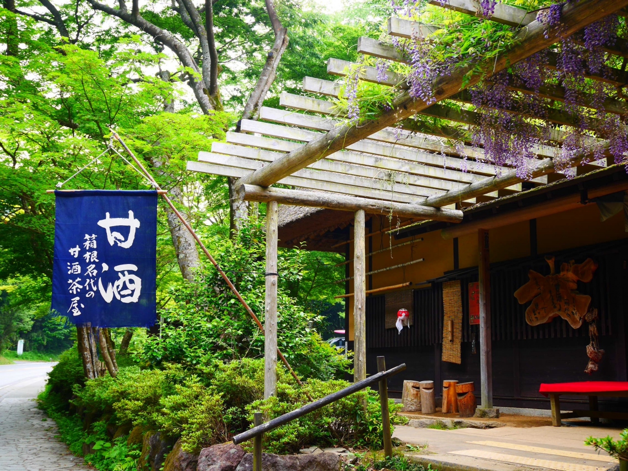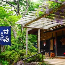 茅葺屋根の風情のある建物でお餅と甘酒をいただきました。