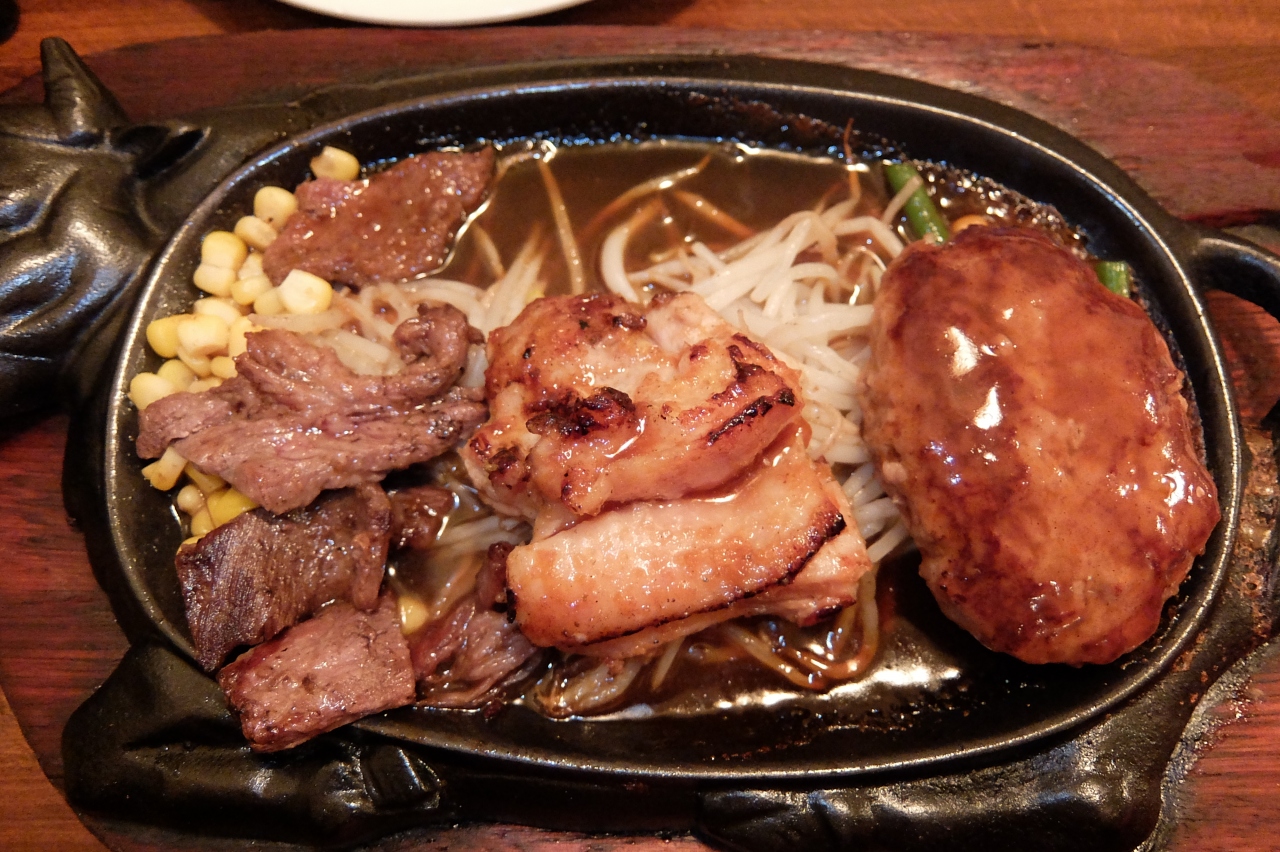 JR水道橋駅から徒歩2分の場所にあるステーキ、ハンバーグなどのお店です。どのメニューも大変リーズナブルでボリュームも満点です。ディナーセットを食べましたが、スライスステーキ、チキン、ハンバーグの組み合わせに、ライス、サラダ、スープがセットになっており、サービスビールも付いていて、大満足のセットでした。