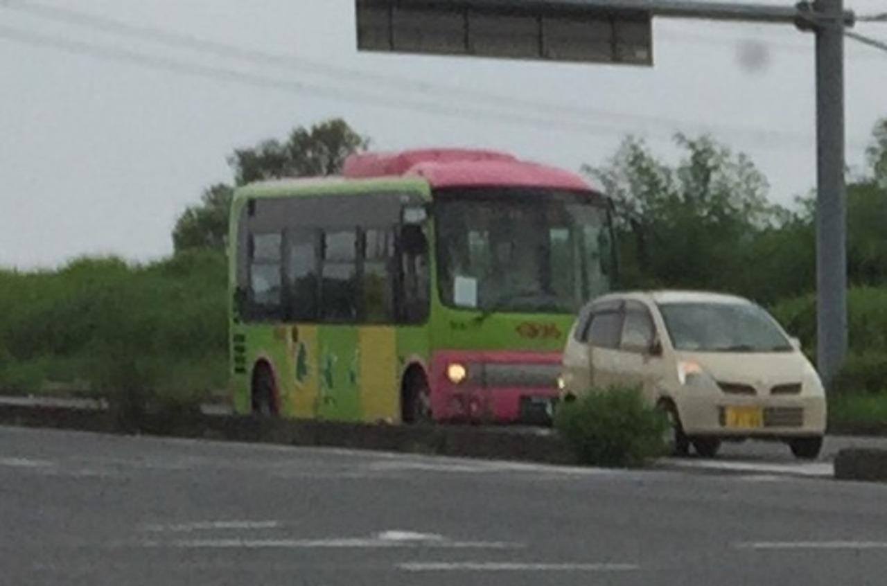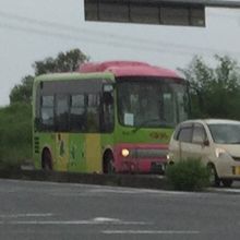 黄緑とピンクのバスで、目立ちます。私的には、どうしてこの色を選んだのか?とも思えるのですが。