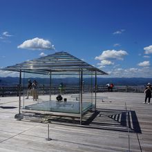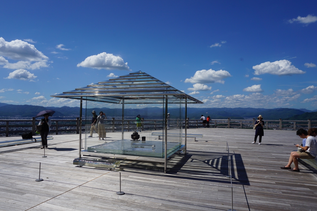 将軍塚は京都が一望できるスポットとして有名なのですが、市営展望台では景色は見えても荒れているのでイマイチ気分が出ない。こんなのが有名スポットといえるのかなあとがっかりしていたら、人の流れは違う方向にある。その流れについていくと、清蓮寺の奥ノ院という大日堂。有料の施設ですが、こちらはウッドデッキのすばらしい展望台が備えられていて、これは快適。総ガラス造りの茶室という現代アート作品も展示されてたりしていて、将軍塚に行ったなら、ここに行かないと話にはならないでしょう。