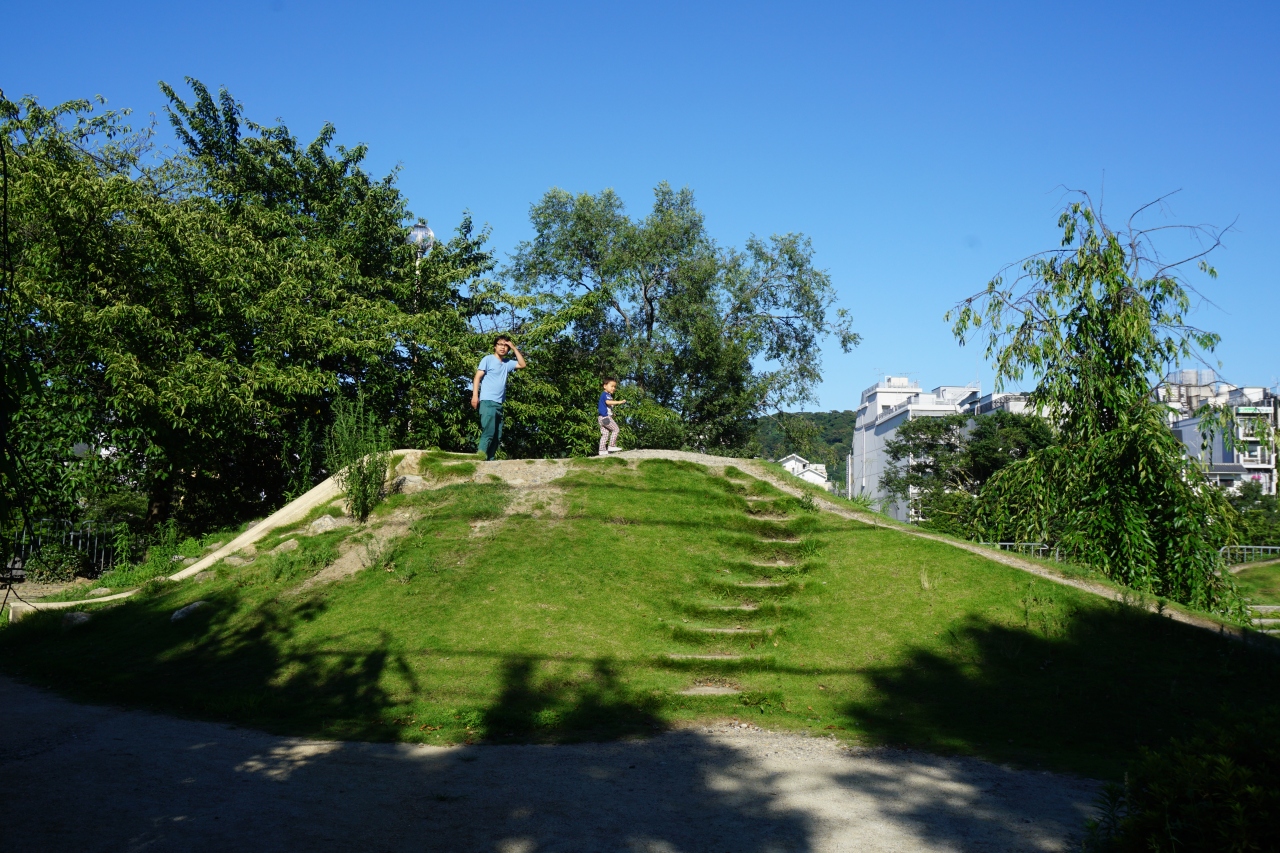 先斗町公園って、これですかあ。先斗町に公園があるのは知っていましたが、たぶん、今までは見過ごしていたんでしょう。しかし、夕方近くになって、西日ですけど日が当たって、向こうには鴨川の流れ。芝生の小山の上に小さな子供を連れたお父さんの姿が見えて。やっぱりなんか風情がある。小さな公園でも、ちゃんと京都してるかなと思いました。