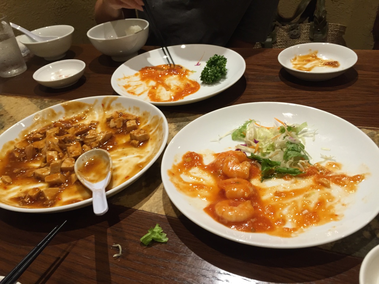 麻婆豆腐と海老チリのランチを注文。麻婆豆腐はなんだか日本の味噌に似た味噌味。海老チリは食べた時には感じないけど、後から辛さが広がり美味しい。ランチはスープ2種類が食べ放題。この日はコーンの中華スープと、野菜と玉子の中華スープ。今までスープで失敗したことはない。