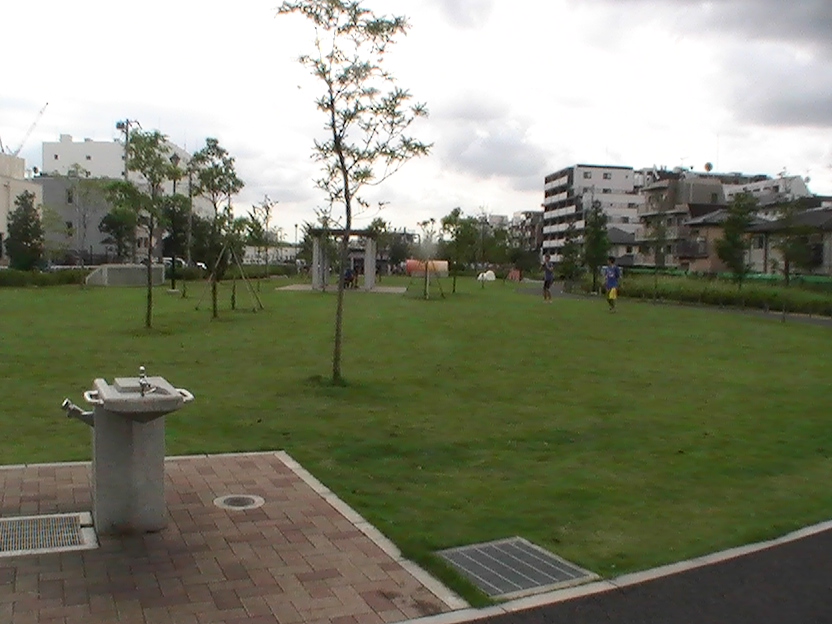 この公園は、「水とみどりのネットワーク」の拠点となる場所で、広場の南側は、立会川緑道のしながわ花海道とつながっており、春にはカワヅザクラや、一面のシバザクラの花を楽しむことができます。中心には芝生の広場があり、下水道のしくみについて知ることができる案内板も設置されています。